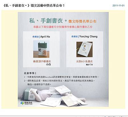 最近很幸運的在 <私。手創書衣>徵文活動中,中獎了